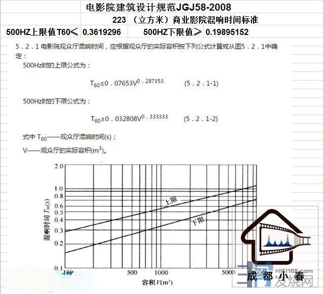 国家标准 《电影院建筑设计规范JGJ58-2008》里223立方面混响时间范围为500HZ上限RT60不高于0.32秒,下限不低于0.18秒
