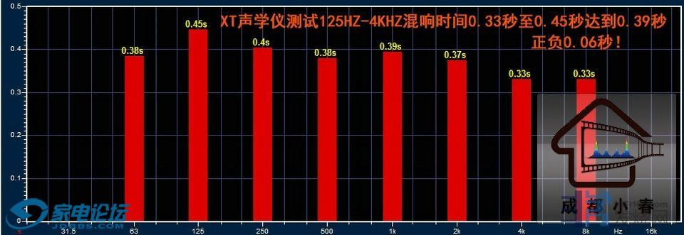 XTZ声学仪测试:125HZ到4KHZ的6个倍频混响时间0.33秒到0.45秒达到0.39秒正负0.06秒;