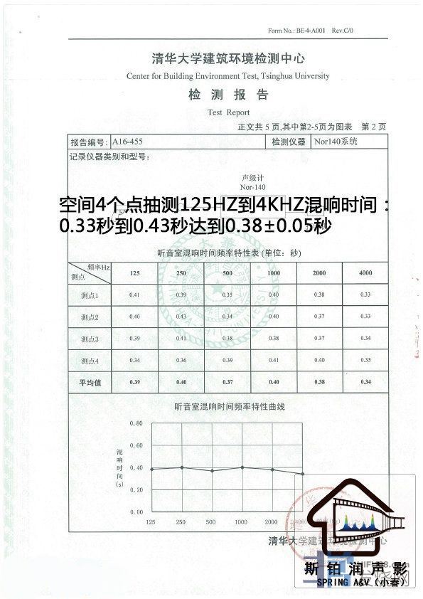 空间对角线平均等分4个点测试125HZ到4KHZ,共24个频点,混响时间全部位于0.33秒到0.43秒内,达到0.38秒正负0.05秒;