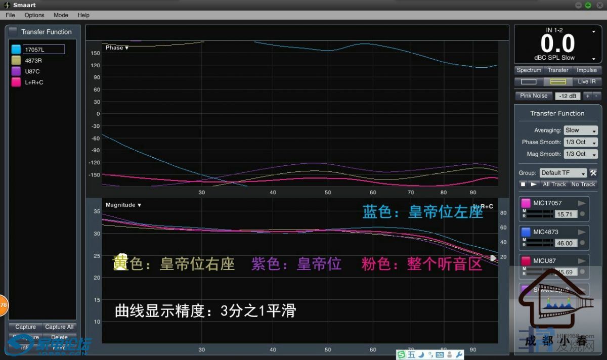 测试结果:蓝色曲线为皇帝位左边座位,**为皇帝位右边座位,紫色为正中皇帝位,粉色:整个听音区频响;