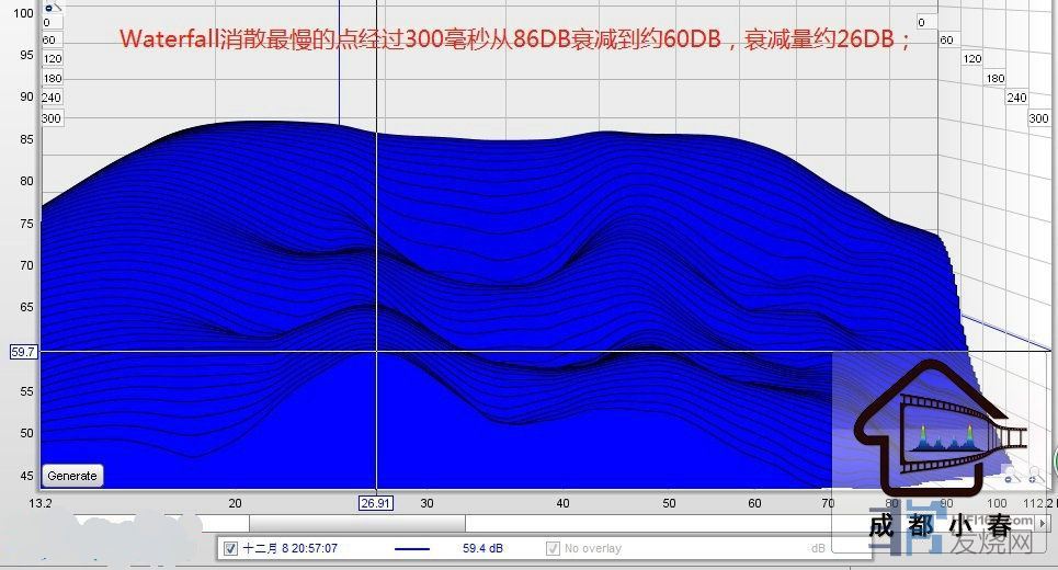 瀑布图WaterFall消散最慢的点经过300毫秒从86DB衰减到约60DB,衰减量约26DB;