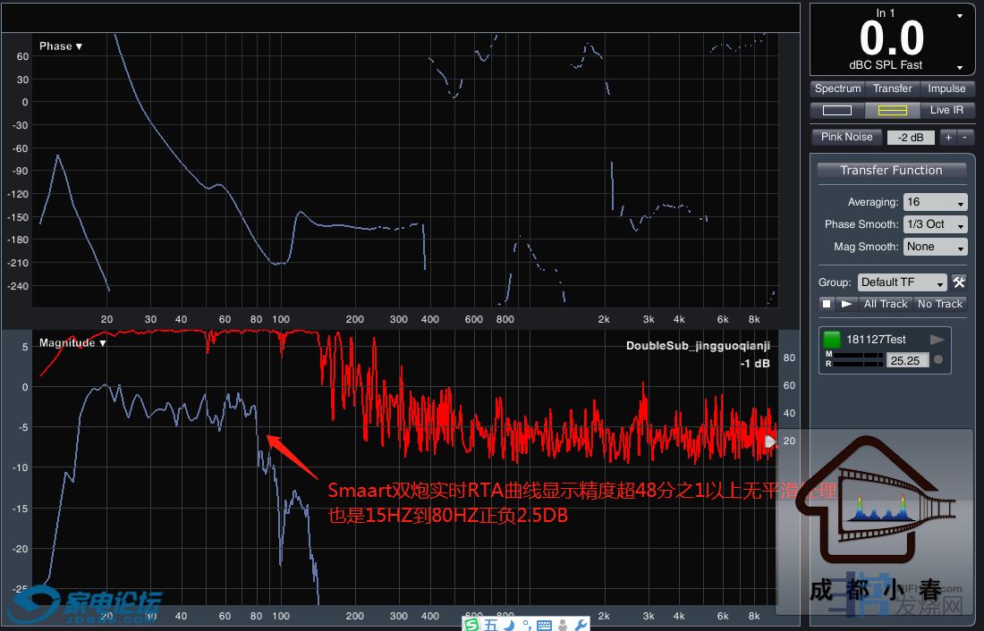 Smaart测试低频频响:Smaart双炮实测曲线显示精度超48分之1以上无平滑处理,15HZ到80HZ正负2.5DB