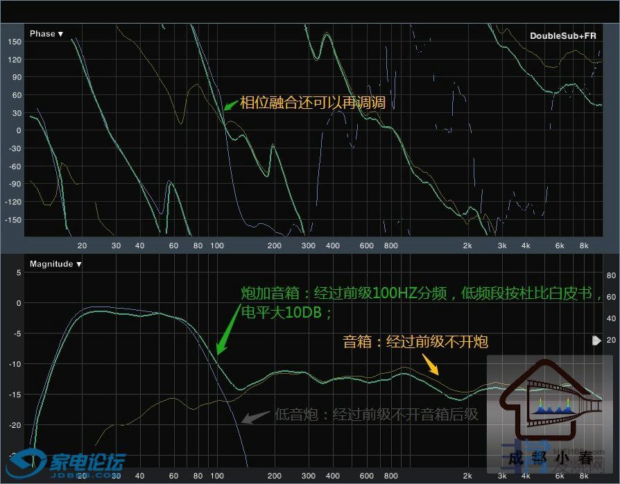 低音炮与音箱各自的频响,相位以及衔接后的频响曲线: