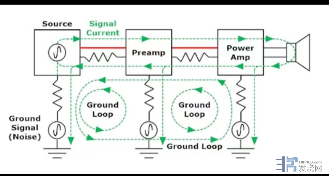 前面的帖子里,镁声也多次提到,谐振不仅是机械谐振,也包括电路谐振。音响线材把一套音响系统的几个大件连通起来协同工作,就造成了多个谐振回路(如图所示)。