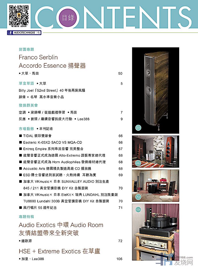 今期封面专题由大草、马田评论Franco Serblin Accordo Essence扬声器,专题特稿:Audio Exotics中环Audio Room友情结盟带来全新突破、HSE + Extreme Exotics 在草庐,其他评论文章包括:SoulNote S-3 SACD/CD播放机、Stromtank S 5000HP、ATC SIA2-100合并扩音机、Vibrato R1三文治紫铜签名特别版音响架、Audio Note Meishu Line 300B Tonmeister Silver 、PS Audio Stellar 唱头放大器、Audio Desk Pro X 洗碟机、Entreq Primer Pro系列 Primer Pro Power 电源线+Primer Pro Speaker 喇叭线、Madison Audio Lab Eclipse AG Solid Core 纯银平衡线、Grimm LS1be / LS1s-dmf扬声器、Bel Canto Stream Network Bridge、Cardas Clear Reflection Power电源线、Chord 2go便携式音乐串流及播放器、Shanling M6 Pro高清无损音乐播放器、Lotoo PAW S1新世代双输出译码耳扩、Acoustune HS1655CU耳机/ ST1000CM升级计划 、 Westone ES70客制耳机 .....,详细内容请参阅目录。