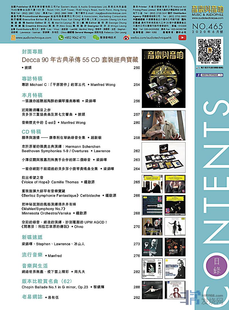 今期的音乐与音响封面专题 : Decca 90年古典承传55 CD 套装经典宝藏。专访Michael C :「平原习作」的第三代。本月特稿: 一张让你越听越陶醉的钢琴独奏专辑、近期难得瞩目之作 ~贝多芬三重协奏曲及第七交响曲。CD特稿:精准与激情 ~ 康泰利在华纳录音全集、忠于原著的德奥古典演绎: Hermann Scherchen Beethoven Symphonies 1-9 / Overtures 、小泽征尔与雅嘉烈殊携手合作的第二个录音、一套你绝对不能错过的贝多芬小提琴奏鸣曲全集 、拉出希望之音《Voice of Hope》Camille Thomas 、重现指挥大师罕有音乐宝藏《Berlioz Symphonie Fantastique》Celibidache 、把神秘莫测的风格演绎得井井有条《Mahler/Symphony No.7》Minnesota Orchestra/Vanska、空前的录音,绝后的演绎,妙到毫颠的UPM AGCD !《闵惠芬:科拉芯草原的传说》,其余的最新碟评、音乐与生活、版本比较赏名曲、老易网志 …等等栏目也是同样内容丰富,记紧捧场啊!
