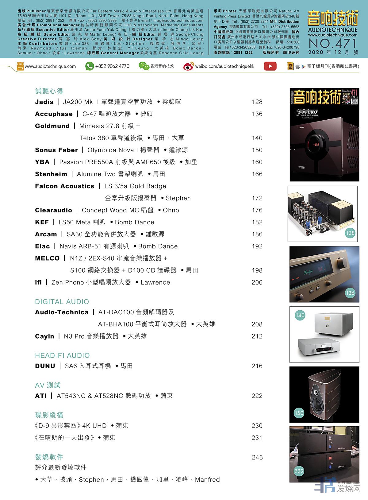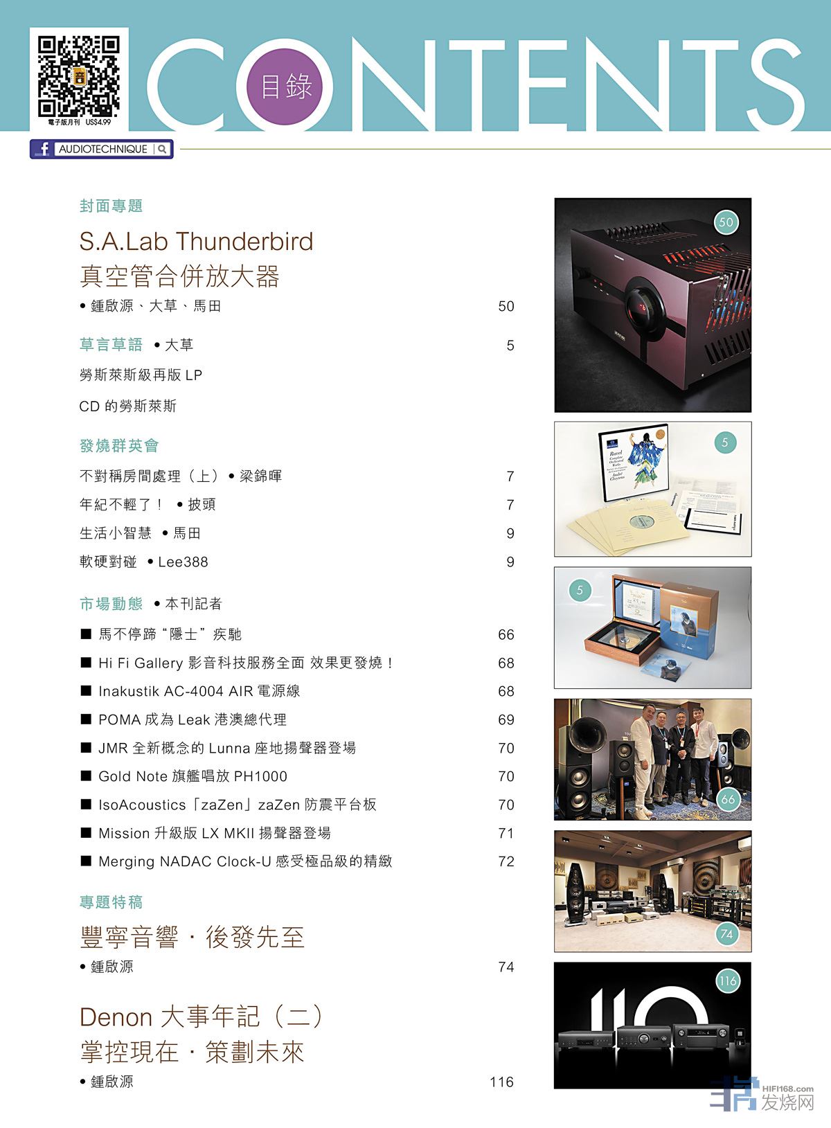 今期封面專題由鍾啟源、大草、馬田評論 S.A.Lab Thunderbird真空管合併放大器。專題特稿:Denon 大事年記(二)、豐寧音響.後發先至。其他評論文章包括:Jadis JA200 Mk II 單聲道真空管功放、Accuphase C-47唱頭放大器、Goldmund Mimesis 27.8前級 + Telos 380單聲道後級 、Sonus Faber Olympica Nova I 揚聲器 、YBA Passion PRE550A前級與AMP650後級、Stenheim Alumine Two 書架喇叭 、Falcon Acoustics LS