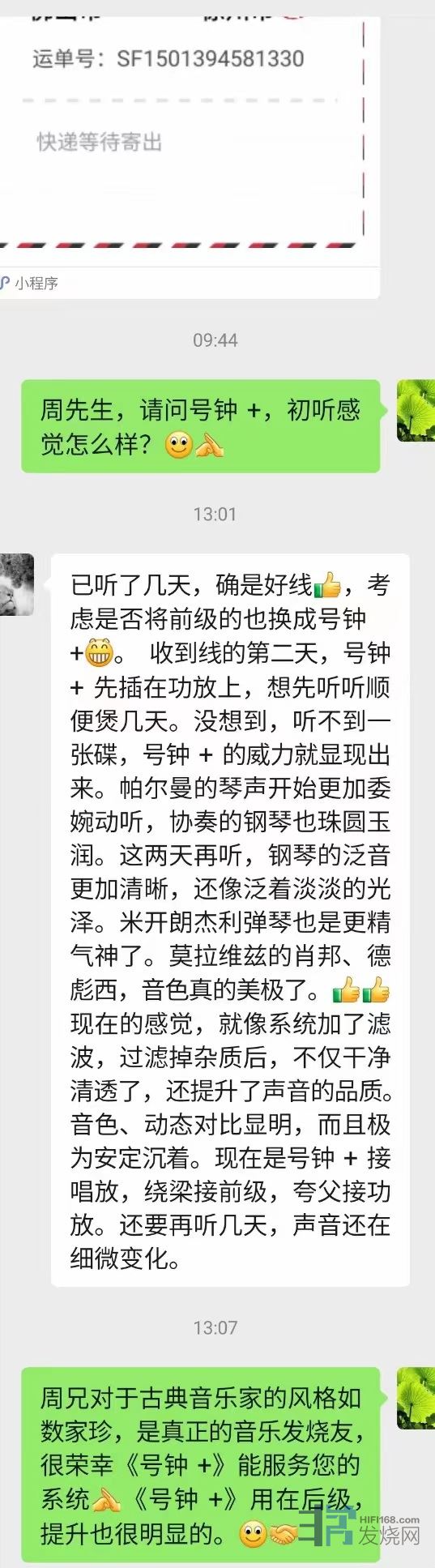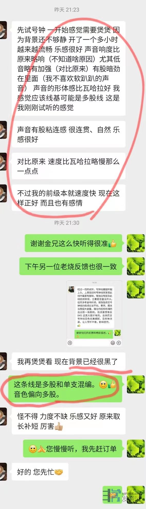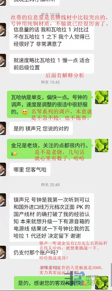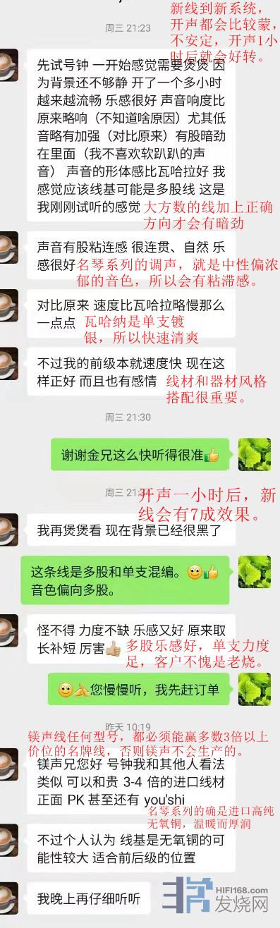 客户最终的结论是《号钟+》比他在用的2万大元的音乐丝带的瓦哈纳还好,所以开心入手。其实镁声认为,换套系统,也许会有不同的结论。所以建议烧友们入手线材,一定要在自己的系统对比,提升明显,满意效果才确认购买。