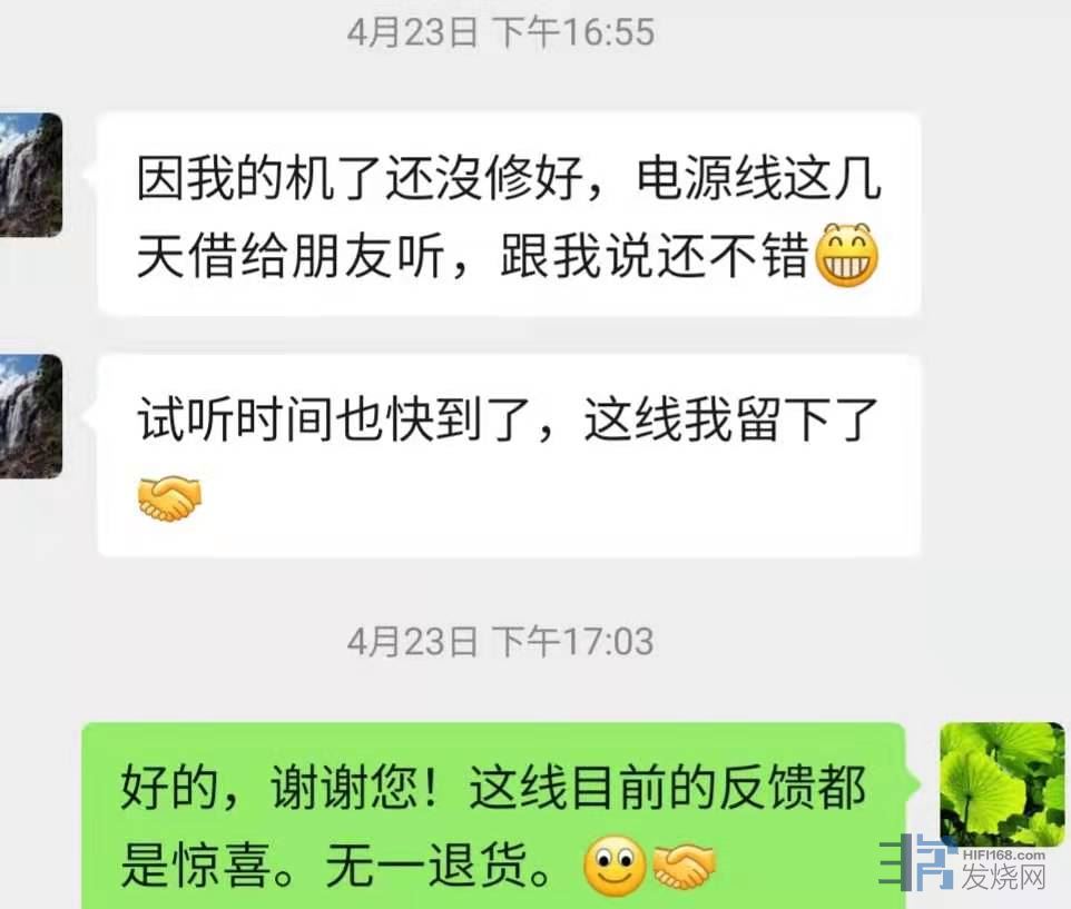 退货不做任何要求,可以把这几天抢到的线全部退掉。千万别不好意思。您付运费试听镁声的线材,已经给镁声机会了,如果镁声线不能打动您,那是镁声技术和调声不过硬,本人需要深刻反省,怎么会怪买家呢?需要说明的是,这批线材都是全新制作,大家收到后,请插上系统使用一周才下结论,不要一耳朵感觉和之前自己的线听感不同,不适应,就马上退货。镁声线是全部校准电气方向的线材,所以新线也绝不会刺耳,但需要使用几天音场和两端才能充分打开。
