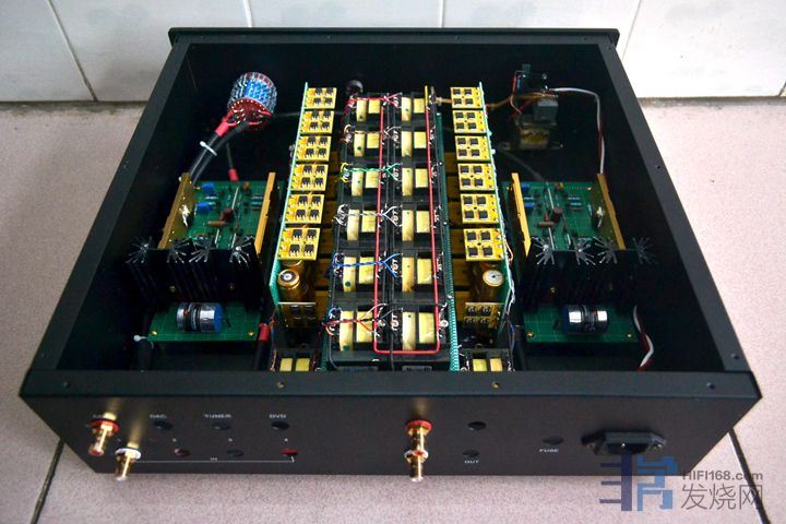 大量使用英国和弦包银线芯,信号线是镀银线,板上的音频跨线使用了几十元一米的纯银线。音量电位器为日本ALPS27型。变压器、功率管和阻容元件贴有超过60张的UFEEL高级音响实验室的合金贴(花费200多元),用于吸收杂乱电磁波和微震动。废除原机电源线,加装了一个尾插座,使用时请注意电源相位,可用电笔测出排插和功放的火线,把电源线对应插上。功放火线如果插到插排零线去,声音会变得单薄和冲。保险丝用的是瑞士舒特,是经过本人正反比对过的,和火零线一样,不要弄反。