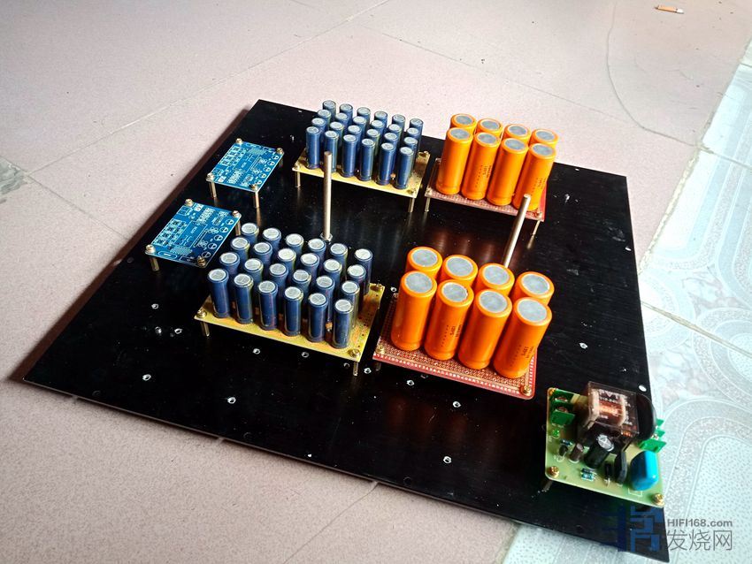 电压放大级的滤波电解松下3300uf50v8对,电流放大级用松下22000uf50v电解一对。因空间和成本限制,电压放大级没有采用稳压,优点是声音开放,缺点是线条感不如稳压。输入缓冲级用的是扼流圈即π型滤波电源板一块。