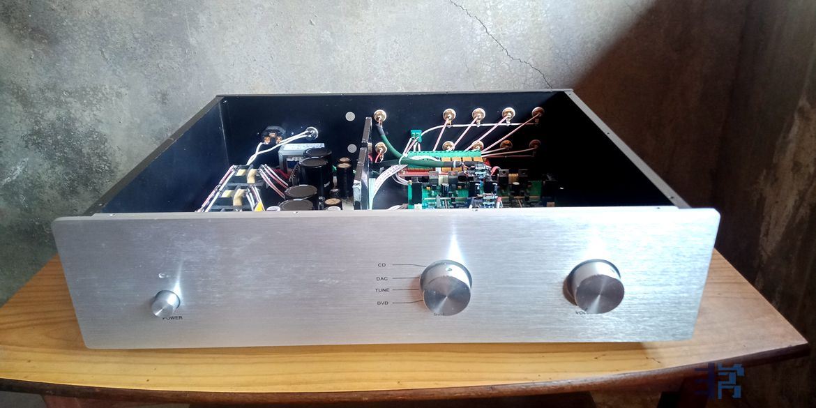 减少工业色彩,增加人文气息,采用以万能板为基板的放大电路板平面搭棚技术,纯手工制作。就近相连的元器件引脚搭焊在一起,只有一个焊点(pcb板三个相连的脚就是三个焊点),大幅度减少焊点数量,降低焊点过多形成的二极管效应 。相距较远的音频连接点和地线走线均采用发烧线搭焊,音色音质明显比pcb板铜箔走线优越;