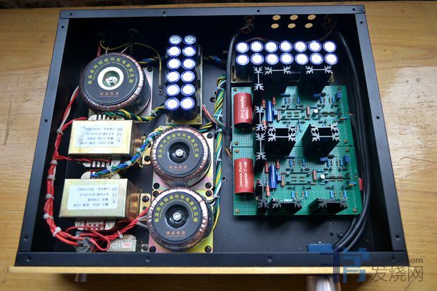 9个进口拆机EI型变压器,10W15v-0-15v,空置中心抽头,两个变压器次级串联形成30v-0-30v,大部分采用倍压整流,形成8组电源8路供电,供电压放大级部分。电流放大级也就是输出级供电为一个国产拆机300W环牛。