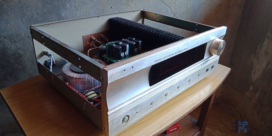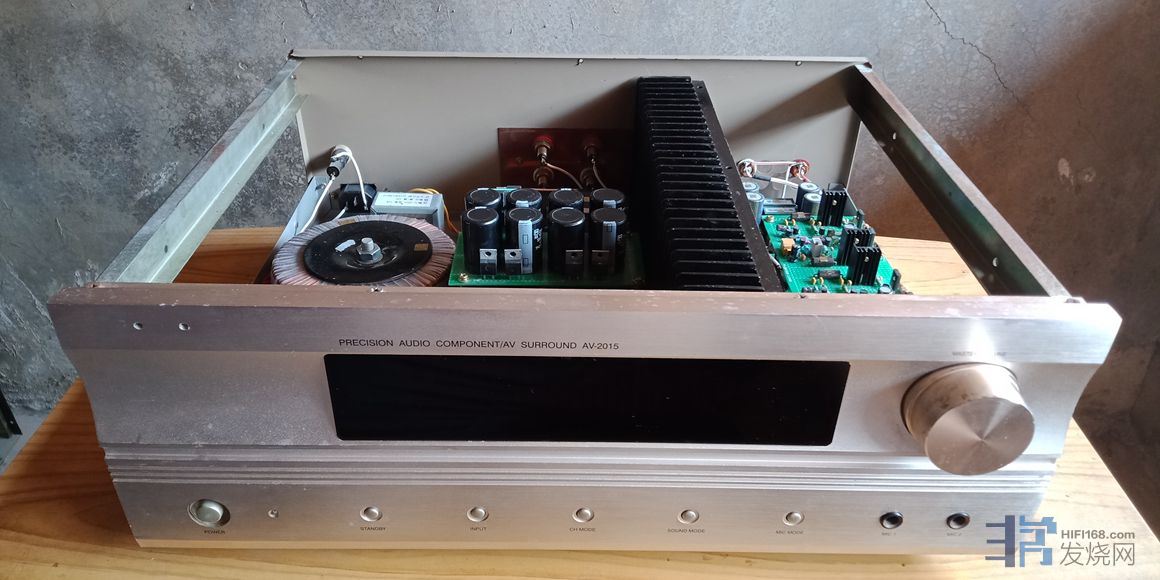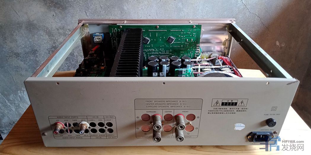 废旧利用之10变压器单9路供电全对称全电流放大合并式功放一台,功率2*70W。使用一个国产AV功放旧机箱和手头上淘汰、闲置的旧材料再补充一些全新材料装制而成。机箱有明显使用痕迹,前脸还行,盖板则有划痕和变形。显示屏保留通电,可以点亮,但没接放大板,所以灯光是静止的。