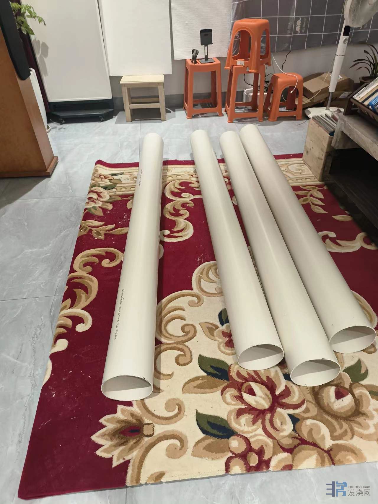 5、竖直放置的排水管,下部开槽,除了留出三个或者四个脚站稳之外,其余全部开槽,高度30~60mm,里面放一个厨房洗菜沥水用的多孔塑料篮子,把吸音棉抬高,离地顶起来,至少不低于开槽的高度,不让吸音棉在正立面露出来,可显著提高吸收低频的效率。我的体会是仅此一点提升音质的幅度不低于升级贵价线材。