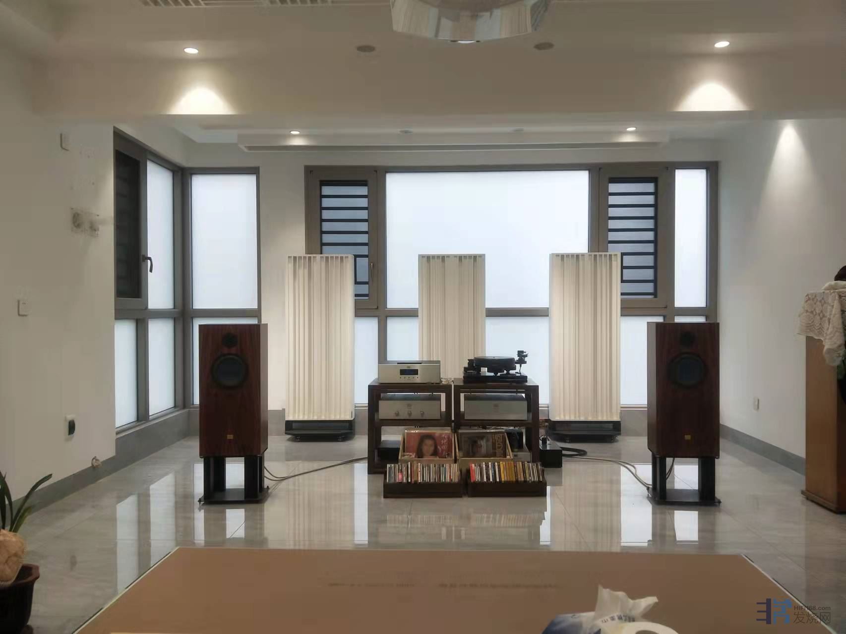 音箱后面的落地玻璃窗,乃是万恶之源,必须处理,不管用什么办法。主要是玻璃的刚度不够,中低音传过去会引起震动,玻璃一旦震动坏处多了,中低音的能量损失,全频段有杂音、毛刺,音色错误,平衡感差,等等等等,毛病多了。所以说是万恶之源!不处理的话,再花一两百万购置、更换器材都没用。处理好了再谈扩散、吸收等等声学处理,再来说好不好听,现在说好听或不好听通通不算数。这是性价比最高的处理办法,也是最有效的办法。
