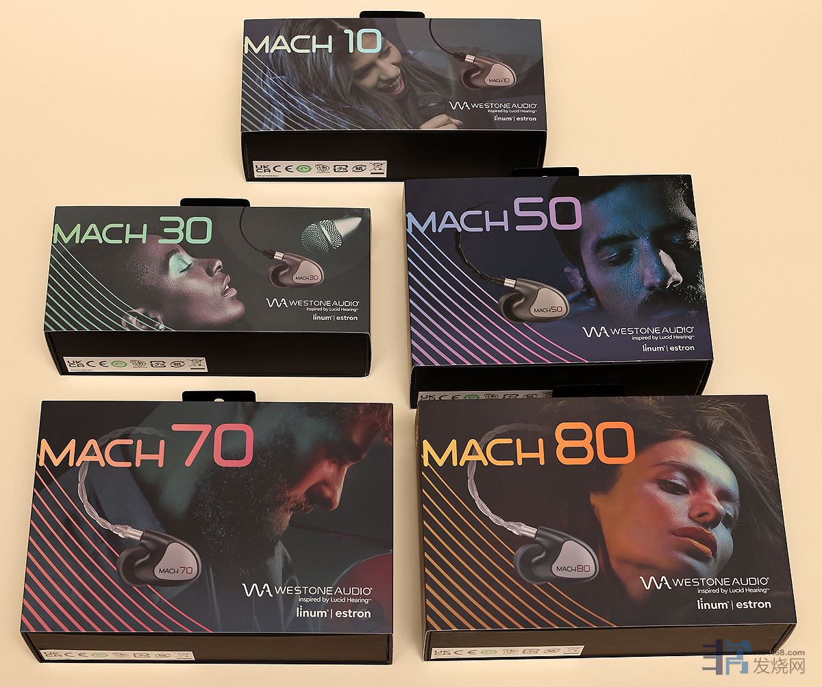 这八款都是动铁耳塞,分别是MACH10内置一个动铁单元、MACH20内置两个动铁单元......MAHC 80内置八个动铁单元,非常简洁、易记的命名方式。