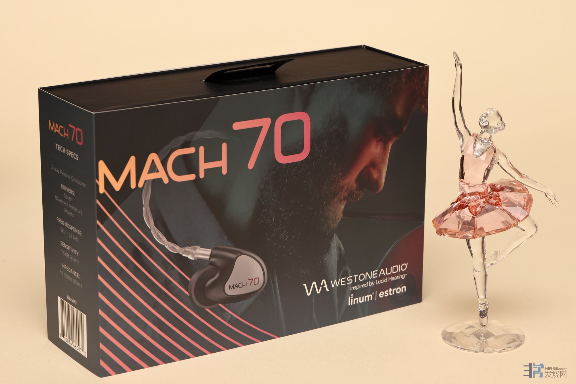 MACH 70的灵敏度是110dB,频响范围5Hz-22kHz,阻抗是42欧,也属于低阻耳机,容易推动。