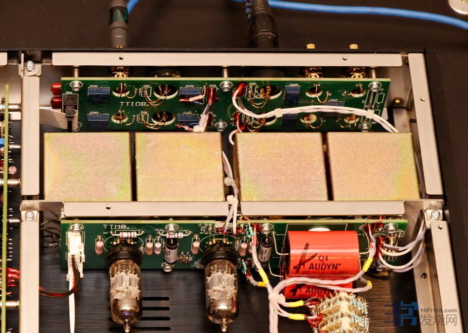 tt前级一共配置了4个变压器做输入输出牛,都采用高矽钢片混合坡莫合金做铁芯。