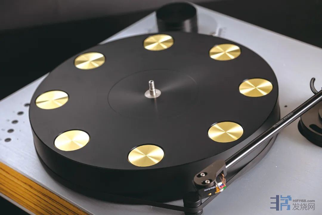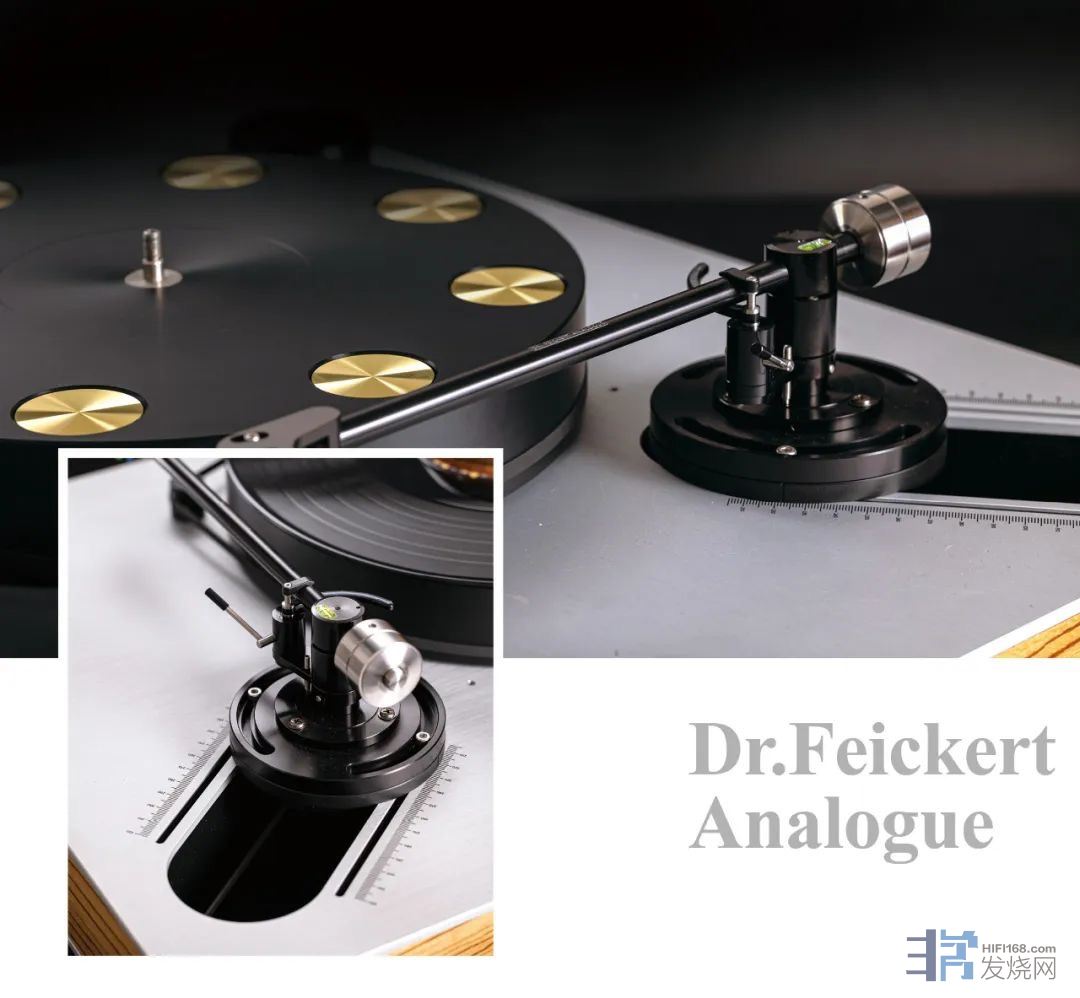德国Dr. Feickert Analogue公司所处木工业以及精密钟表技艺发达的地区,制作高级黑胶唱盘所需要的能工巧匠以及原材料资源自然比其他地区有先天优势,每部Dr. Feickert Analogue黑胶唱盘都带有光滑斜边的拉丝铝顶板和底板,MDF箱体与实木结合是Dr. Feickert Analogue唱盘的特点。黑胶唱盘的避震无非就两种,软盘和硬盘,软盘是利用弹簧、气浮、磁浮或者软阻尼材做避震,硬盘则是利用自身的重量或者低谐振材料抑制转盘的震动,无论是软盘设计还是硬盘设计主要避免自身唱盘的电机转动或者外界的震动。唱盘自身的电机震动很多人可以理解,但对外界震动对唱盘的影响可能没搞明白,比如附近有工地在打桩,隔壁有人在施工敲打墙壁或者钻孔,乃至听音室喇叭声音震动传递到唱针上,影响唱针拾取黑胶唱盘讯息的精确度,黑胶唱片的讯号是非常微弱的,这种弱信号音源最怕的就是震动,一点微小的震动通过唱放放大最后到功放和喇叭重复出来就彻底变形,因此发烧友常说黑胶唱盘的声音很难搞好。而硬避震盘与软避震盘的设计也不是两全其美的,各自有各自的声音优缺点,软盘声音温暖但动态和高频延伸差一些,硬盘动态和频宽更好,音色上没有软盘的温暖润泽。