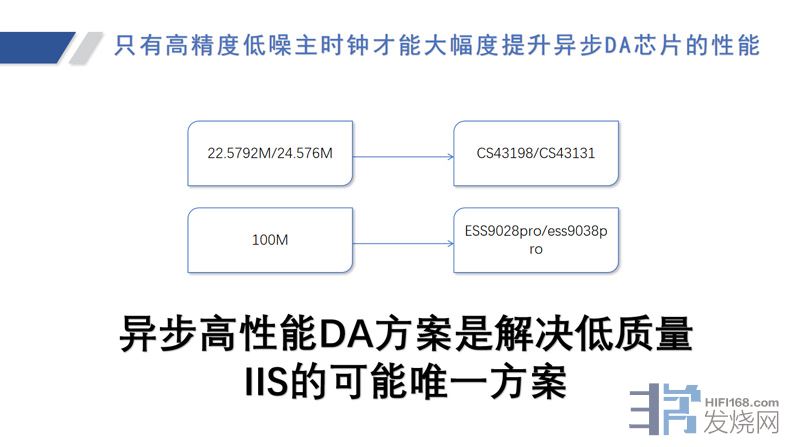 得益于我们台机的经验,像一些几万价位的高端解码器它的100兆时钟就用OCXO,为什么要用OCXO呢?因为,它能够大幅提高它的数字接收的质量。它是做ASRC异步重采样的一个技术。异步DAC它的时钟是可以完全不同步的,它可以独立供一个高性能时钟。通过它内部的锁相环进行二次开发,就可以解决IIS质量非常差的问题。这是我们享声去深度挖掘出来的技术。这也可能是解决低质量IIS的唯一方案。