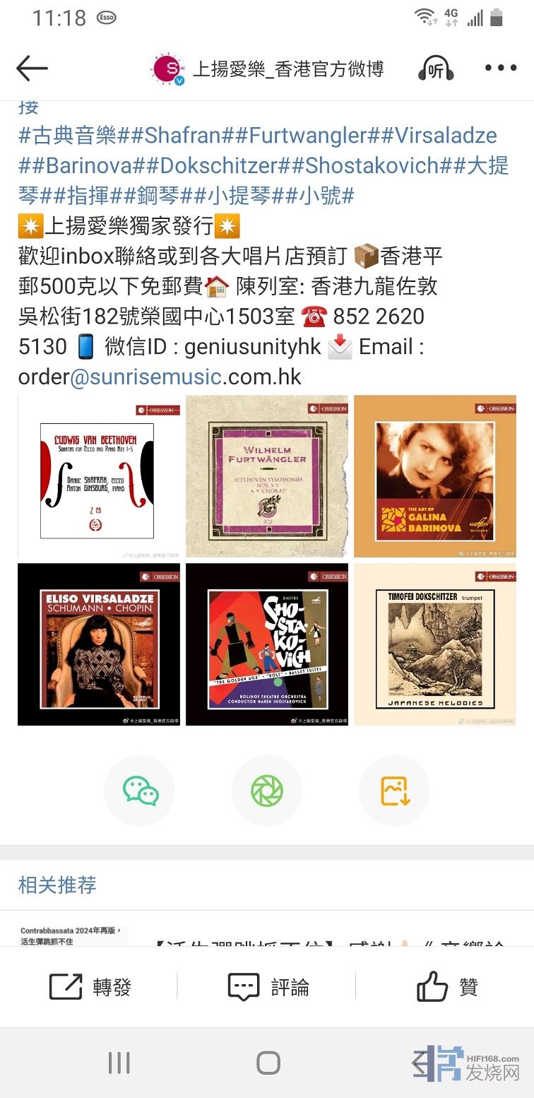12月下旬,六款新品: [url]https://...... ANDRE 发表于 2024/12/8 8:14:00  預于12/25上市(香港首發) SMELCD1002709 日 本 制 碟 肖斯塔高維奇: 芭蕾組曲<黃金年代>、 <螺釘> / *雙鋼琴奏鳴曲(op.94) (兒)小肖斯塔高維奇( Maxim Shostakovich) 指揮 波修瓦劇院管弦樂團 l 權威正統靚聲演繹; 樂感豐富生動, 劇力萬鈞 l *珍稀錄音, 肖氏父子 聯手獻藝, 精彩非凡 l 俄羅斯源音母帶無壓縮輸出、低音染,原味十足! | SMELCD1002708 ( 2CD優惠價) 日 本 制 碟 蕭邦:*第1 號鋼琴協奏曲 / 波蘭幻想曲 (op.61) 舒曼: *鋼琴協奏曲 / 幻想曲 (op.17) 薇莎拉茲(E. Virsaladze) 鋼琴/D. Kitaenko指揮 莫斯科愛樂 l *1977年3月11日莫斯科音樂會紀實 l 師事俄羅斯鋼琴巨擘紐豪斯(H. Neuhaus)與查克 (Y. Zak); 被李希特 讚譽 為”當代舒曼最佳詮釋者! ” l 俄羅斯源音母帶無壓縮輸出、低音染,原味十足 | SMELCD1002296 ( 2CD優惠價) 日 本 制 碟 貝多芬: 五首大提琴奏鳴曲 (全集) 沙夫蘭 (Daniil Shafran, 1923~1997) 大提琴 金斯伯格(Anton Ginsburg,1930~2002) 鋼琴 l 俄羅斯大提琴巨擘,與羅斯特波維奇(Rostropovich)齊名,珍貴立體聲錄音版本 l 1630年製 阿瑪第(Antonio Amati) 銘琴靚聲演繹 l 俄羅斯源音母帶無壓縮輸出、低音染,原味十足! | SMELCD1002705 ( 2CD優惠價) 日 本 制 碟 貝多芬: 第五號<命運>、七號、九號<合唱>交響曲 福特萬格勒(Wihelm Furtwangler,1886~1954) 指揮 柏林愛樂 (Berlin Philharmonic) l 二戰時期(1942/1943年) 期間三場傳奇名演”源音版本”, 福氏指揮藝術代表力作 l 權威正統演繹; 樂感豐富生動, 劇力萬鈞 l 俄羅斯源音母帶無壓縮輸出、低音染,原味十足! | SMELCD1002707 日 本 制 碟 <多克西哲的小號藝術> (日本民謠篇) Timofei Dokschitzer (1921~2005) 小號 l 俄羅斯第一小號名家, 演奏風格帶有文學家的浪漫氣質及盎然的詩意 l 立體靚聲錄音, 精彩改編/演繹13首著名日本歌謠: 櫻花/紅蜻蜓/這條路/早春賦/ 夏日的回憶/故鄉…等 l 俄羅斯源音母帶無壓縮輸出、低音染,原味十足 | | SMELCD1000997 日 本 制 碟 <芭莉諾娃 的小提琴藝術> Galina Barinova (1910~2006 ) 小提琴 l 輯錄俄羅斯傳奇小提琴女傑1940-1960年期間 珍稀錄音: 舒伯特《Arpeggione》奏鳴曲 (小提琴改編版)/ 史麥塔納《二重奏》/冥想曲/圓舞曲/詼諧曲/ 幽默曲/美國民謠《稻草裏的火雞》… l 俄羅斯源音母帶無壓縮輸出、低音染,原味十足 |