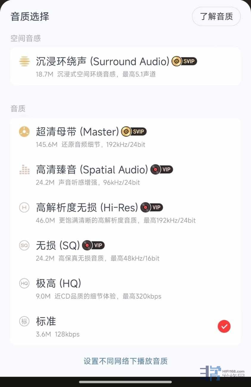 在播放歌曲信息界面点击播放上方的音质选择按钮可以选择不同格式的音质,当然,想要听高音质的音乐需要开通网易云音乐付费会员才能听了。
