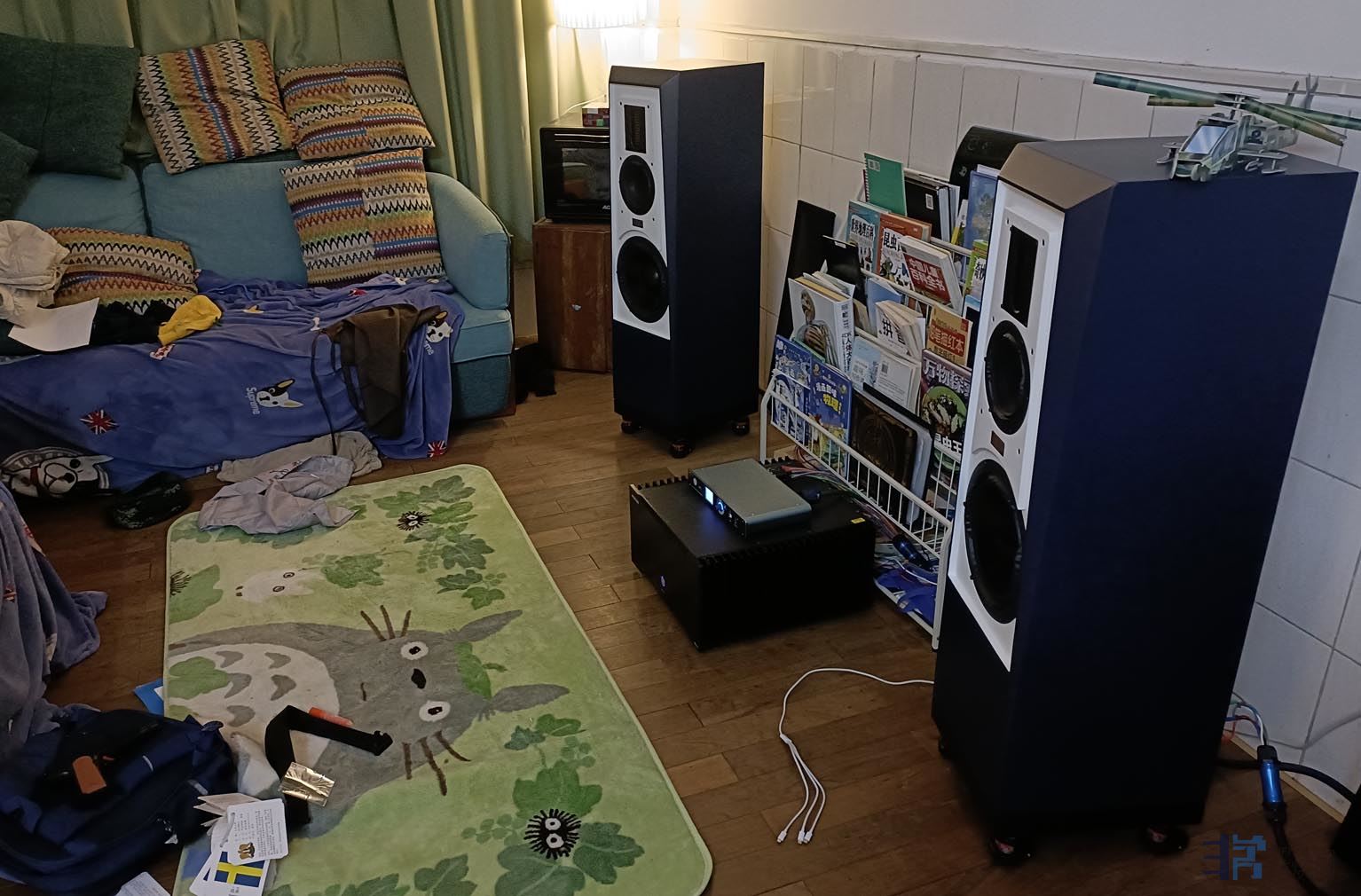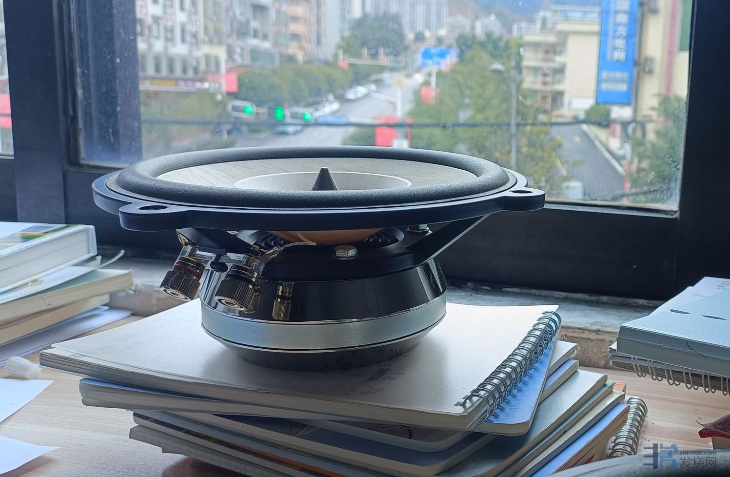 装配好以后的样子,但这个音箱指向性设计的缘故,不适合横摆,当时只是没有适合的脚架