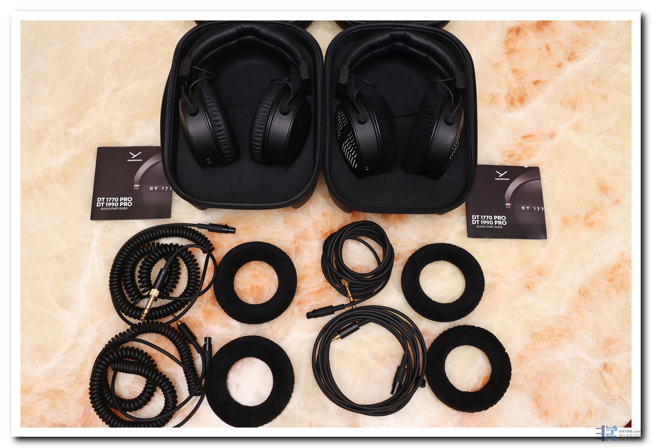 1770 配置一副天鹅绒耳罩, 一副皮质耳罩;1990配置两副天鹅绒耳罩,这两副耳罩有微调声功能,孔多的可以增加低频,孔少的频响更平直。