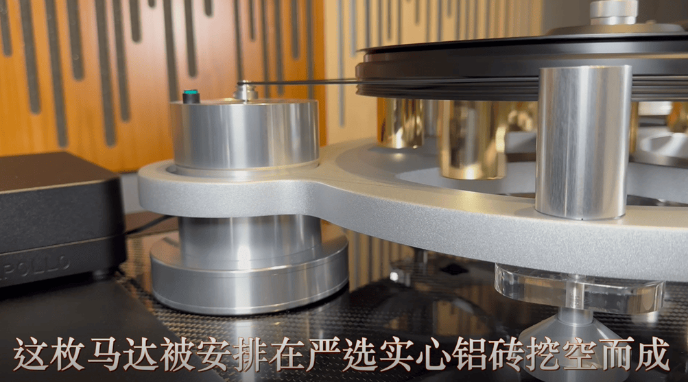 跟其它 Michell 黑胶唱盘一样,陀螺仪 精装版 所搭载的动力核心,是一枚超低谐震,由直流策动的马达。这枚马达被安排在严选实心铝砖挖空而成,分体式圆柱型独立外殻里。