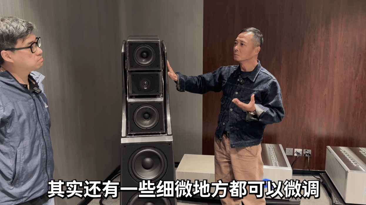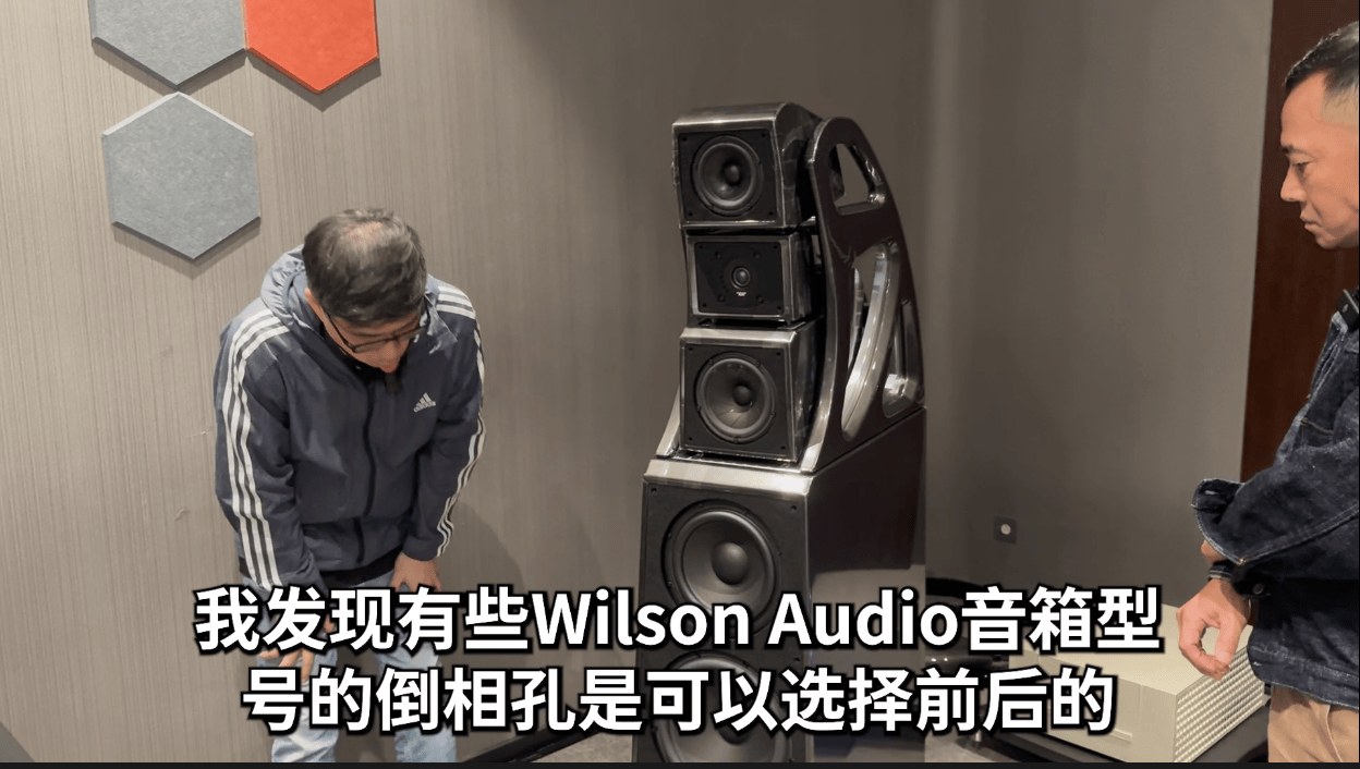 假设高音单元模块的设定是6档,你可以尝试调高一档看看效果,高音会稍有延迟,感觉就会不同,这是一种根据个人喜好的微调技术,当然,不能偏差太大。不能完全凭自己的耳朵去判断,然后去移动三个单元模块,这样做是不可能的,一定要遵循指引,基本上是按照工厂的指引,再结合自己房间的环境,可能调高一级或者调低一级。这是在可允许范围内的。波仔:另外,还有一个问题,我想替广大音响爱好者问一下,我发现有些Wilson Audio音箱型号的倒相孔是可以选择前后的,比如这对Alexx V亚历斯V,原装倒相孔是在后面的,我们为了配合这个房间,就选择了前面的倒相孔,这种前后选择的影响有多大?