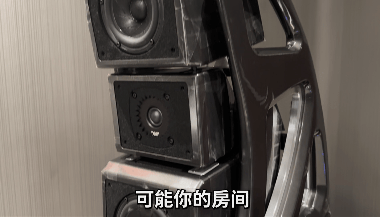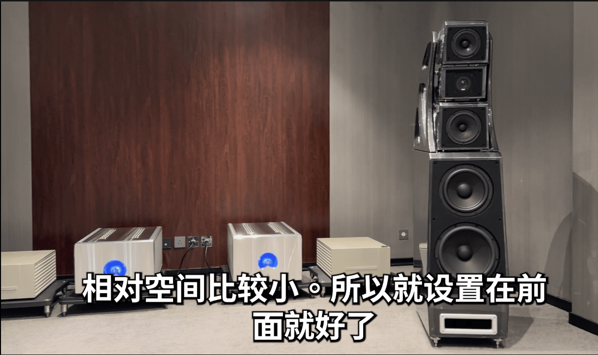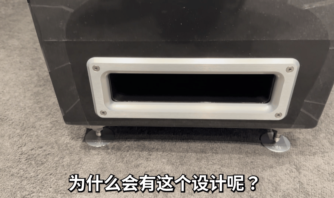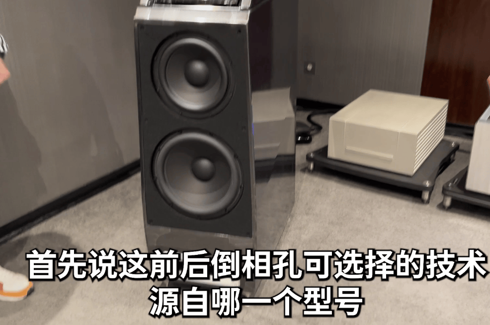 低频会更丰富一些,所以这是非常特别的设计,市面上其他音箱没有这种能根据房间情况调整低音的设计。这种低音调整不是通过电子调校,而是利用一种物理排气现象,能帮助你的音箱在这个空间里排气更顺畅。这非常实用,应用范围很广。基本上,向后设置时,低频会增加1-2dB;向前设置时,则会减少1-2dB,没错。如果地方较小,就像我们这个聆听室空间相对较小,那么设置在前面就可以了。