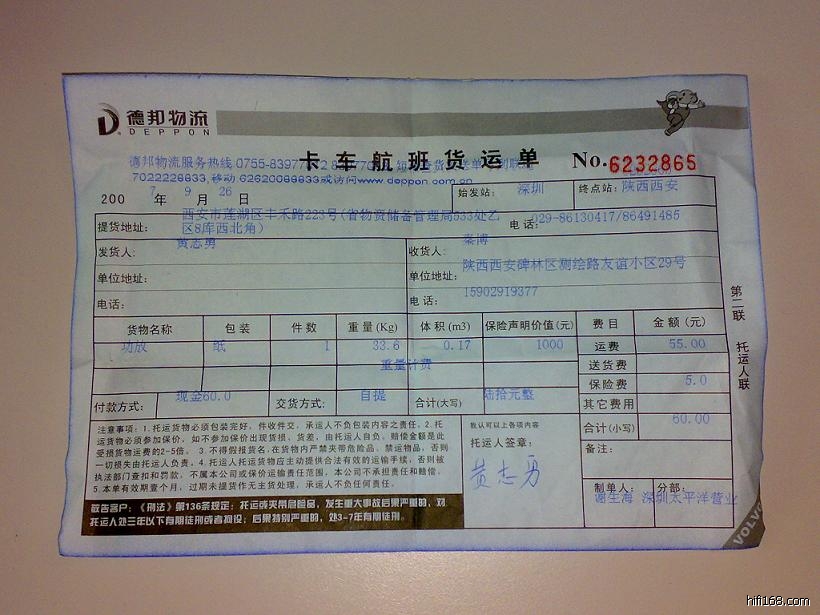 原帖由 goodboy 于 2007-9-22 14:45:00 发表达明兄:广东信宜黄兄的货今日已发出(DENON1500RII),走华宇。