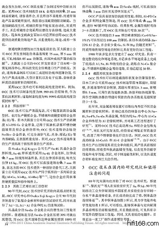 A couple of years later the "nines" race began. This refers to how many times the number "9" can be repeated when specifying a metal's purity. The prime contaminants in very high purity (99.997% pure, four nines) copper are silver, iron and sulfur, along with smaller amounts of antimony, aluminum and arsenic. The purity of OCC Copper can reach up to 99.9999% and even higher几年后,纯度9的竞赛开始了。这里提及的意思是当指出金属的纯度时有多少个9重复出现。在高纯铜(99。997%纯度,四个9)里最原始的杂质有银,铁,硫还有少量的锑、铝和砷。OCC铜的纯度可以达到99.9999%甚至更高。哪句话的意思是说把纯度故意说多9呢?他的意思是商家为了质量的提高,而讲究更高纯度的材质。如果按照你那么讲的话,那和最后一句话不是自相矛盾了吗?再说了文章是从OFC无氧铜开始讲起的,他有一个过程的, 我们不追求多个9的纯度又何来OCC?看文章我们得前后连贯。上面有位老兄把OCC的资料都传上去了,这个在全球工业行业里面都已经应用到了,都是大野的OCC,万隆的大野授权书也不是假的。你说我把6N说成7N随便你,这个不是我说的,全世界都这么说,大于99.99998%完全可以超越7N,又何来夸大?你和我算成本,随便你。你忽视OCC的技术来算成本,那全世界的铜材都得上天去.其实技术一旦被人掌握就不再是神话了!!!