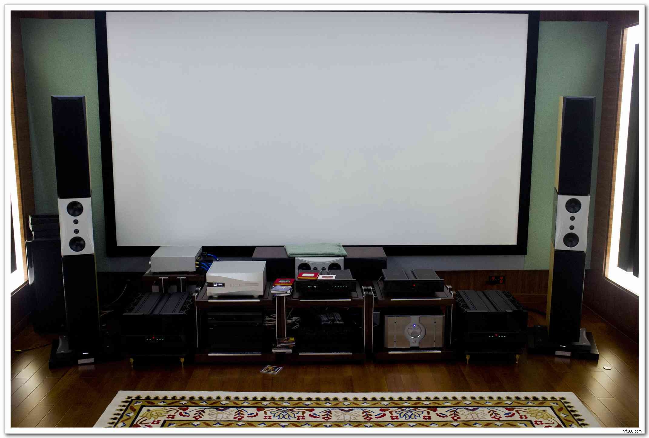 他的房间有60平左右,梯形,请香港设计师设计的。有一些低频和中频的陷阱,但高音反射有点过分,后来做了一些吸音,逐渐转好。