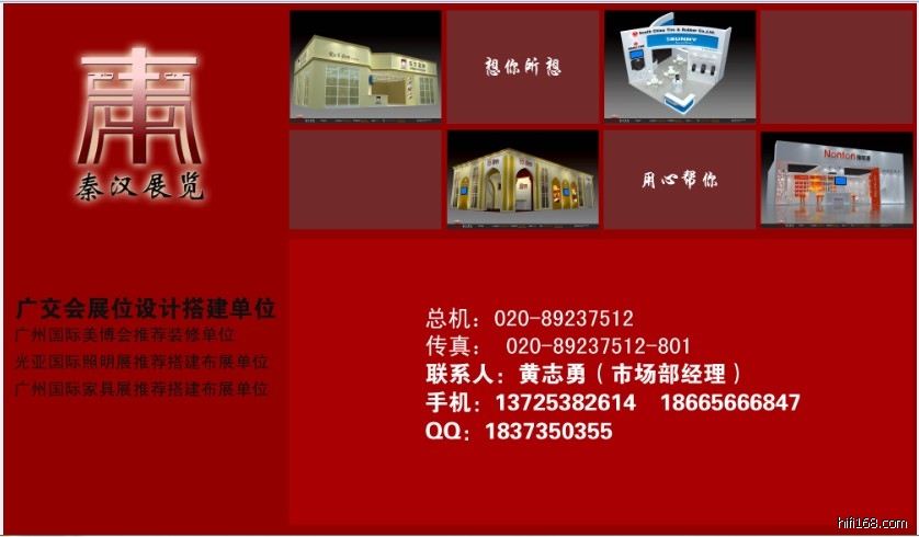 ----------展位设计、展位搭建、展位布展秦汉展览装饰设计有限公司是一家专业从事展览特装设计搭建、展厅设计制作、广告终端展示、活动策划与执行、室内外装修等设计制作业务的专业公司,并相继在北京、上海、开设办事处,服务网络辐射全国,多年来公司积极拓展国内外市场,发展至今已成为全球众多知名公司的合作伙伴。(广交会展位设计搭建装修、广交会展位设计搭建装修)。 现公司有经验丰富的高级设计师十名,3000余平方米制作工厂,通晓专业流程的项目人员200余名,是国内外众多大型展会的指定承建商,并在2005-2011年连续多年被中国权威会展杂志《世界会展》评为“全国十佳综合服务优秀设计搭建商”,同时秦汉展览连续多年被广州国际家具展、广交会、光亚国际照明展、中国国际建材展、广州国际美博会等等做为展台布展搭建单位。 114届广交会展位设计搭建装修/114届广交会展位设计搭建装修/114届广交会展位设计搭建装修秦汉展览装饰设计有限公司 总机:020-89237512 传真: 020-89883131联系人:黄志勇 (市场部经理) 手机:13725382614 18665666847QQ:1837350355
