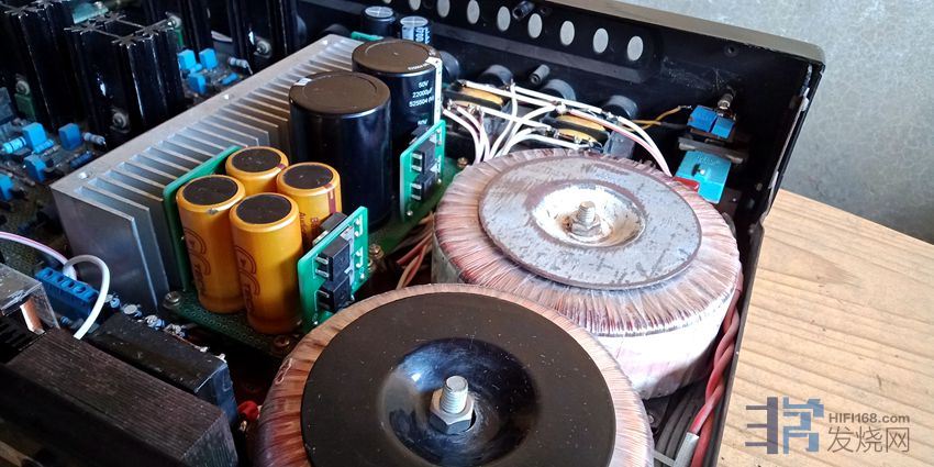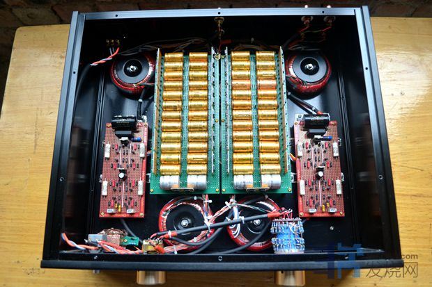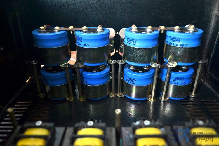 升龙100W方牛2个,出口型25W方牛1个,30W方牛1个,60W方牛1个,总容量315W,15路供电压放大级部分。电流放大级也就是输出级供电为一个120W大厂环牛。机内实际上还有另外1个出口型25W方牛专供输入缓冲级;
