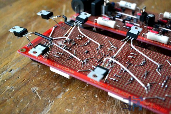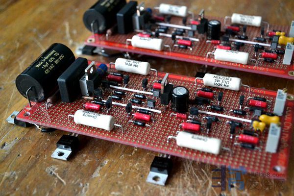 减少工业色彩,增加人文气息,采用以万能板为基板的放大电路板平面搭棚技术,纯手工制作。就近相连的元器件引脚搭焊在一起,只有一个焊点(pcb板三个相连的脚就是三个焊点),大幅度减少焊点数量,降低焊点过多形成的二极管效应 。相距较远的音频连接点和地线走线均采用发烧线搭焊,音色音质明显比pcb板铜箔走线优越;