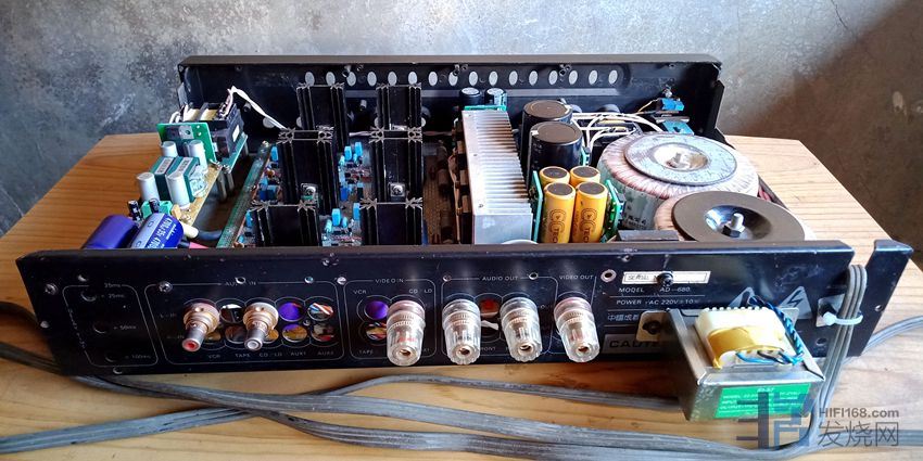 大量使用英国和弦包银线芯,信号线是几十元一米的发烧线。音量电位器为日本ALPS16型,纯铜镀金旋钮。功放自带原装接线,美标插头,地线一脚被上家剪掉,变成了两脚插。使用时请注意电源相位,可用电笔测出排插和功放的火线,对应插上。功放火线如果插到插排零线去,声音会变得单薄和冲。保险丝用的是瑞士舒特,是经过本人正反比对过的,和火零线一样,不要弄反。散热片基板厚达10mm。