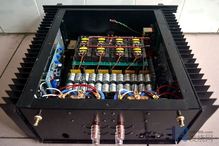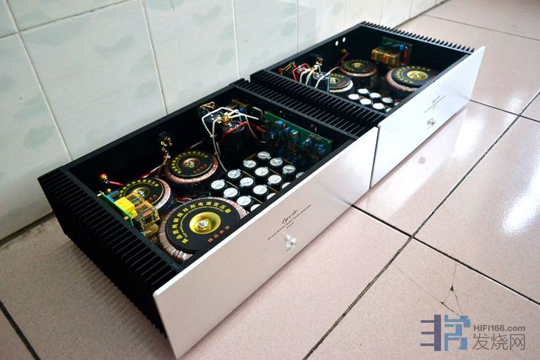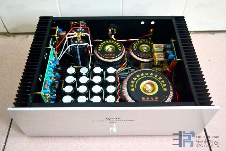 大量使用英国和弦包银线芯,信号线是几十元一米的发烧线。音量电位器为国产贴片电阻步进式电位器,纯铜镀金旋钮,加有纯铜延长杆。功放自带进口美标插头电源线 。使用时请注意电源相位,可用电笔测出排插和功放的火线,对应插上。功放火线如果插到插排零线去,声音会变得单薄和冲。保险丝用的是瑞士舒特,是经过本人正反比对过的,和火零线一样,不要弄反。散热片较小,加了一块紫铜板,即改善散热又起屏蔽作用,机箱底板还加了一块厚铝板做辅助散热。
