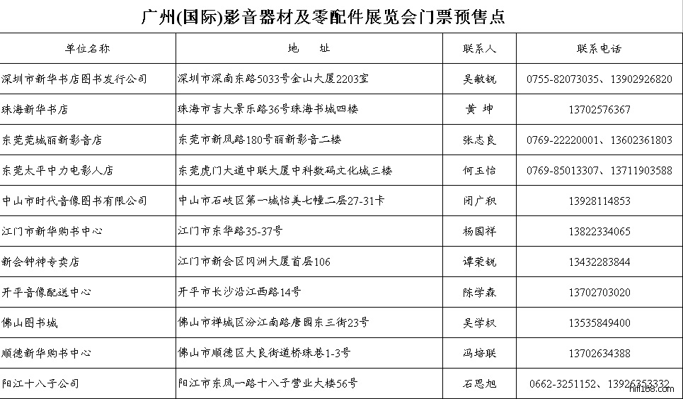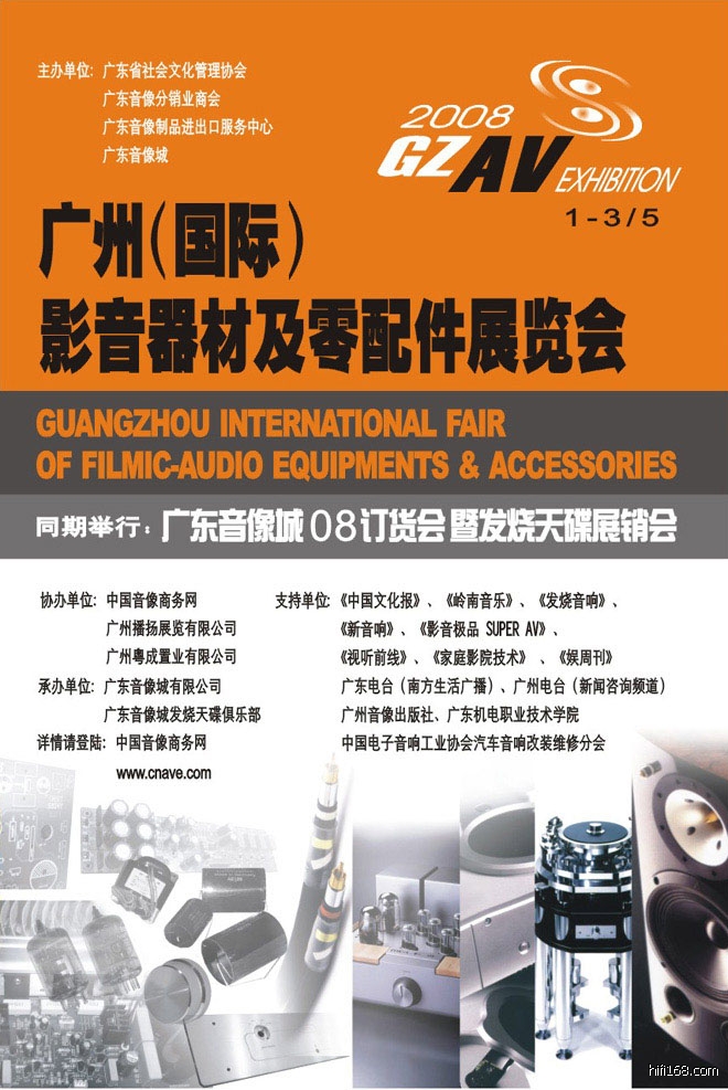 由广东省社会文化管理协会、广东音像城等主办的“广州(国际)影音器材及零配件展览会”将于5月1日至3日在广州市机场路中国国际音像博览会会馆举行。应广大音响(乐)发烧友的要求,展览会的门票将在深圳、珠海、东莞、中山、江门、佛山和阳江等地提前预售,参观者凭票可获赠展会纪念双CD一套。