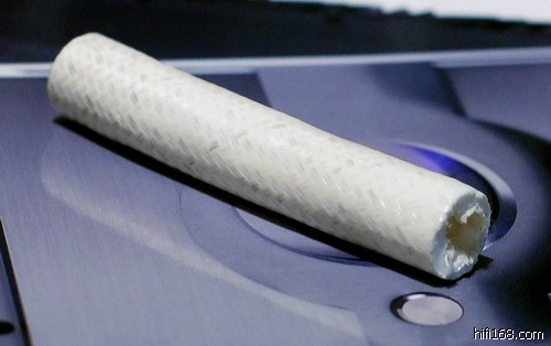 本次要向大家重点推荐的是HOVLAND MAIN LINE电源线。该线为HOVLAND品牌线材中的当家电源线,直径16mm呈银灰色并有金属光泽。线身质地坚实有弹性并有黏滞感,大概是敷裹层考虑避震要求的特殊配方所制,接下来是一层密实的金属屏蔽层,屏蔽网下又设一层白色橡胶填充料牢牢把火、地、零线包入其中!