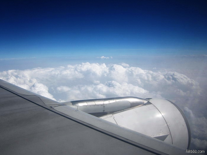 飞机在距地六、七千米高空的云海上翱翔,我则无聊地拿着相机凭窗抓拍。透过舷窗,白云蓝天。朵朵团团的白云连绵起伏,汇成莽莽云海一望无际。望着深邃的蓝天,真希冀这时的天空突然出现