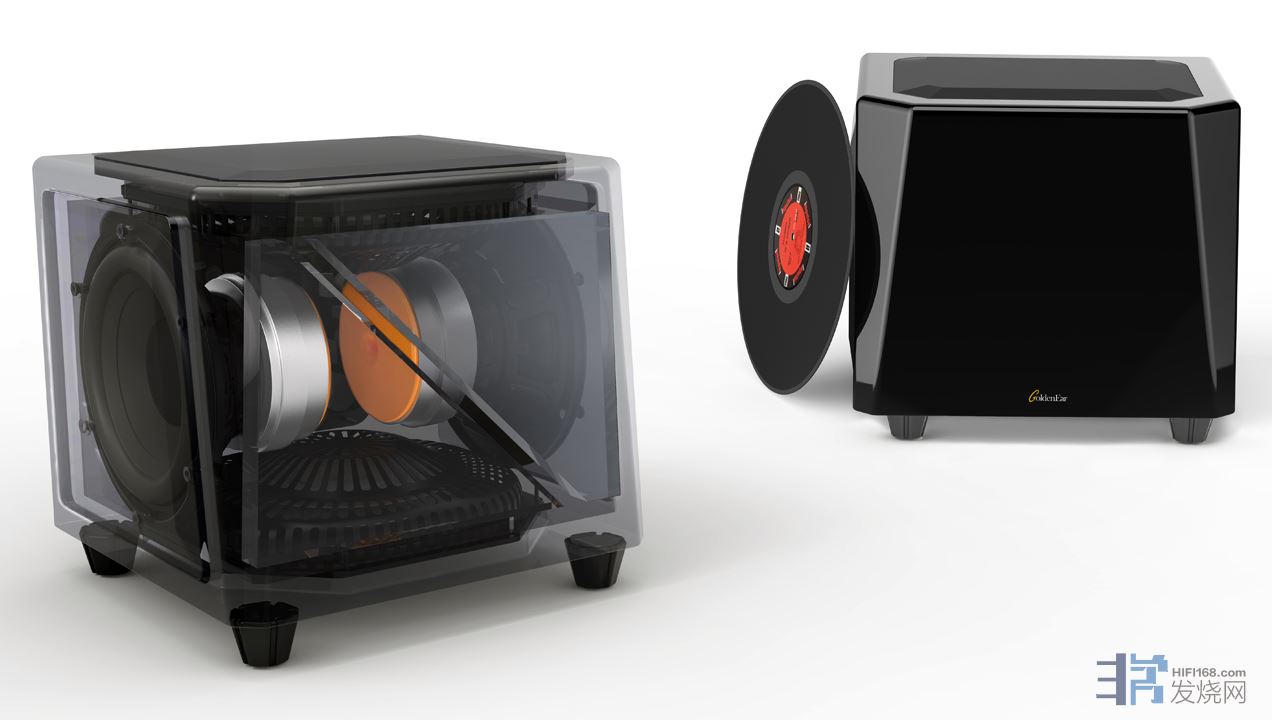X内部也有很多升级的地方。比如与传统的小型超低音音箱不同,后者可能包含单个向前或向下衍射的驱动单元和端口或无源辐射器,GoldenEar采用一对水平对置8英寸长冲程有源驱动单元和2个垂直相对且向上或向下衍射的10 x 11英寸平板次声辐射器。GoldenEar称位于四方体结构中的驱动单元可施加反作用力。“消除力的惯性平衡保留并聚集了单元产生的所有能量,并有效推动箱内的空气。”难怪X采用这种复杂的构造,为的是消除内部压力造成的共振或箱体面板的弯曲。