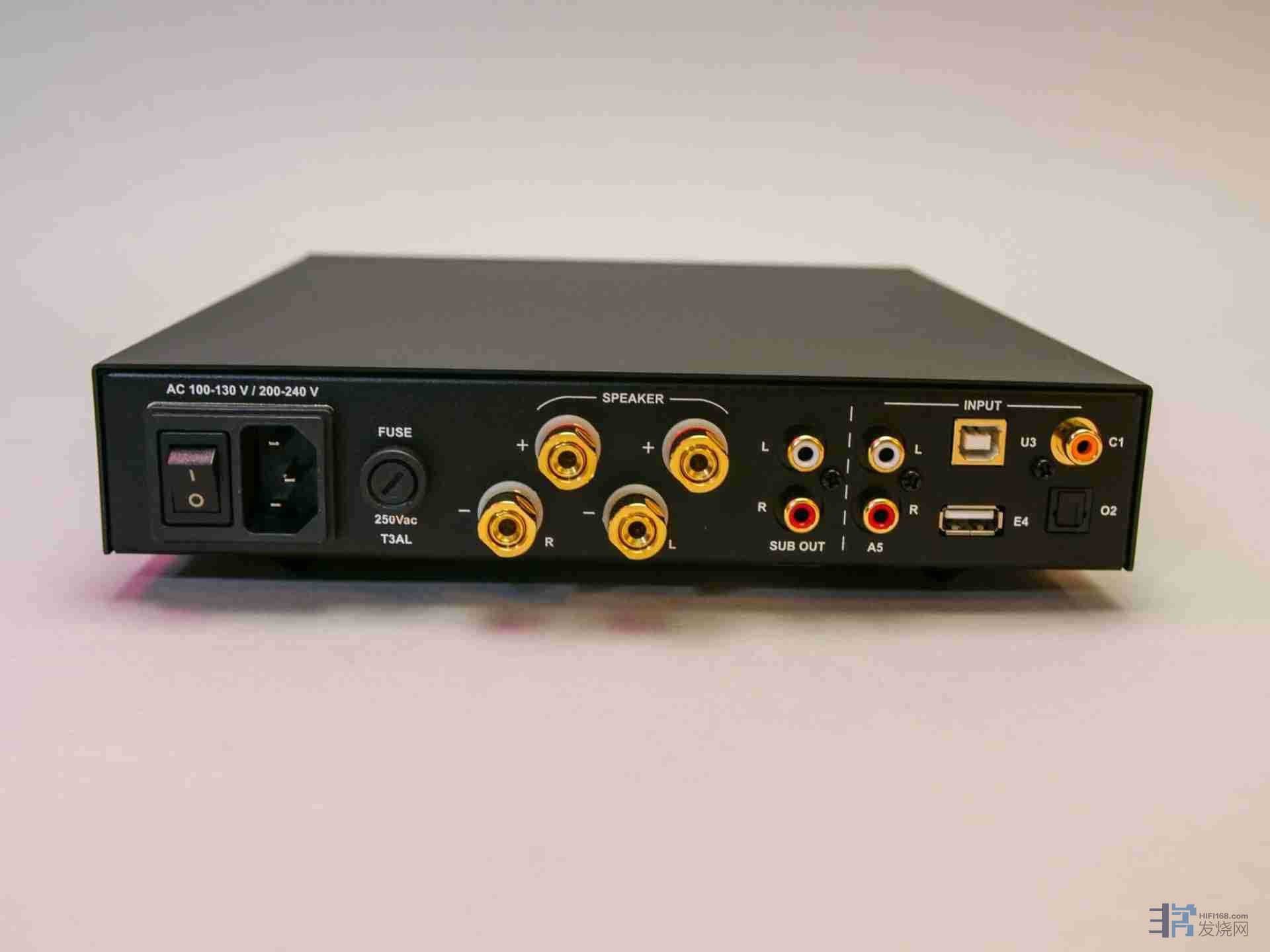 音量从0到99级。在背面,布局非常清晰。我们看到一些漂亮的、镀金的喇叭线接线柱,一组sub-out前级输出和一组rca输入,还有四组数字输入(光纤、同轴、USB和拓展)。