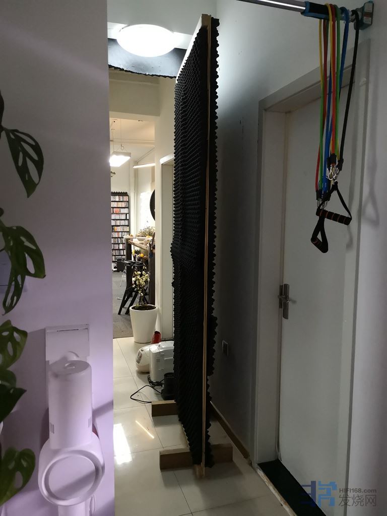 这个空间实际试下来,左侧墙的两个飘窗对声音影响还是比较大的,所以我选择了把帘子放下虚拟侧墙的处理方法应对。右侧墙吴先生用的木丝板效果不错,这种木丝板密度相较我以前看到的要高些,但也不能多用。我拿了一块20*180cm的放在侧墙试了下还是感觉有点吸过头,所以不宜多用。