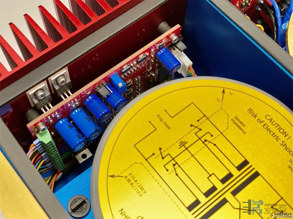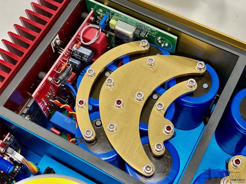 小弟单凭极为有限的料得悉,今代NHB-108的出功率从上代100W×2提高至150W×2,而整体架构则维持4个方格,靠近前面板的两个格分别摆放了两只300VA环牛,这是双单声道供电电路,简单来说供电部份照顾了放大线路、输入及输出级、显示灯这数个主要部份。一般做法是从变压器分拆出独立两三组输出各自应对上述每组,好处是减少干扰及确保稳定供电,当中最重要是应付瞬间输出峰值,例如播放大动态音乐时,在短短数微秒内输出电流的需求会扯上比正常时高数倍,能否平稳地供应电流是取决于娈压器及电容,所以本机使用两只大环牛是十分有道理,余下的两格,平均分布总数12支大水塘(每支滤波电容量是22,000uF),在电容旁边是直立式线路板,每组滤波电容的顶部,分成前后是装有3片大小不同的半月形汇流片,乍看之下我还以为是铜片之类金属物,原来表层镀上了24K金,很明显是为令缓冲的电流比一般金属更流畅。实不相瞒,本刊试音室的两组电箱也有汇流片,每组加了一大片厚身铜片表层亦镀了24K金,从最初至今,供电效果是相当理想,由此可想象第二代NHB-108的供电情况是非常稳健,这次驱动 Stenheim Alumine Three应该问题不大!