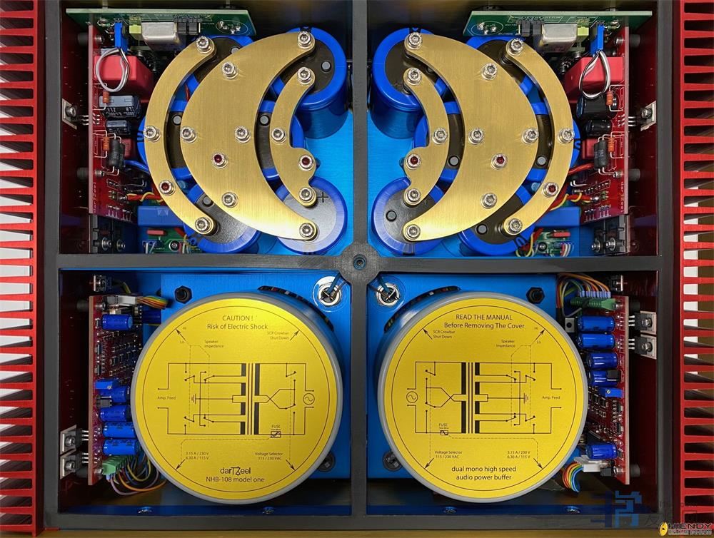 说来说去darTZeel 最为发烧友津津乐道,定是花了16年时间才完成的第一代NHB-108,它的面世不仅象征了Herve Deletraz 个人之技术大成,同时也断定了日后产品的设计路向,本文主角当然也是以这款招牌作为设计蓝本,直到目前,有无数位中外音响评论名家测试了NHB-108,综观各项报导均没有具体指出其内部设计及用料,绝大部份也是重复官方发放的讯息,譬如说这是简单的线路架构,使用两枚功率晶体管、无负回输线路、不设保险丝及继电器...等等,从中可知,Herve没打算对外剖白他设计的线路,顶多就是说每项元件都是精心拣选配对,务求在同一批货源中选出误差值最接近的高质量元件,凑合制作出器材,不讳言,就算是生产元件的厂商亦无法准确掌控质量,同一批次元件,能通过老化、量度及值定检测的很可能只有寥少数,所以天下间的顶班High End器材全是价格不菲。或许在其他人眼中,元件即使是有轻微的质量落差,在实际重播时未必能察觉,然而,Herve把线路设计得太极端了,既没有保险丝也没有使用负回输线路,所有讯号在高速傅真的情况底下输出,任何偏差是会变得明显,不过,话得说回来,若非严选各项元件,后级的频应就不能造出由0.8Hz- 600kHz了!