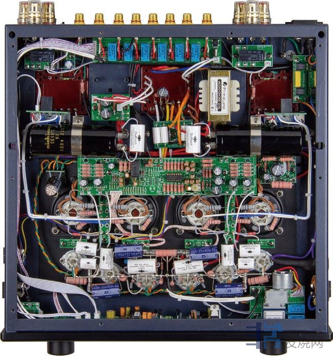 机内选用日本Takman低噪、线性、音乐感强的电阻 器。针对输入切换泄漏噪音的问题,厂方除了选用优质并 包封好的继电器外,并把继电器布置于机内背板,将讯号 路径大幅度缩短,亦避免了不同讯源的输入讯号互相干扰。点对点内部接线,即发烧术语所谓的「搭棚」式焊接亦是本机的设计重点。即是设计尽量减少使用PCB印刷电路板,尤其针对真空管座下的布置,避免真空管的高热令 PCB变形、老化、故障等问题,而「搭棚」的成本亦明显较高。EVO 300的机内接线选用瑞士制镀银OCC纯铜导体,以Teon 绝缘。