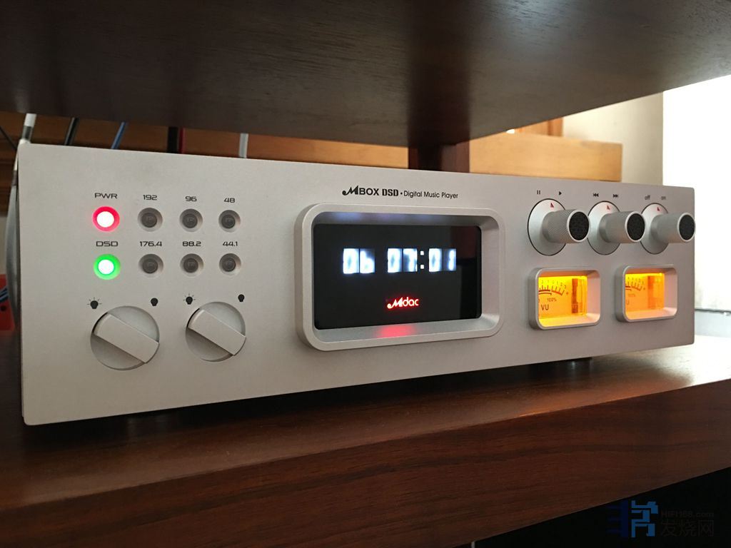 第一次听到MBOX的高清播放器应该是15年在朋友家,当时被它与主流回异的复古专业仪器般的外观吸引住了眼球,非常喜欢。而印象中首版的MBOX的声音表现也是颇具古意,模拟年代般的声音与外观相当的契合。2016版的外观最明显的改变就是原来面板左边的方形指示灯换成了圆形发光管,多了两个开关可以关闭频率识别指示灯和仪表的背光。对于外观的变化,个人喜好倾向于首版的方形指示灯,这个新版的外观感觉有些许违和。MBOX附送的遥控器为手机遥控,音乐文档的唱片封面、格式、时间等等信息都能在所配的手机上显示,个人以为既然手机具有详细的显示,那么机器上的显示屏如能也可选择关闭,显示屏下方的红色logo调暗些,那么在比较暗的听音区域听音乐时就会减少受影响,投入感更好。